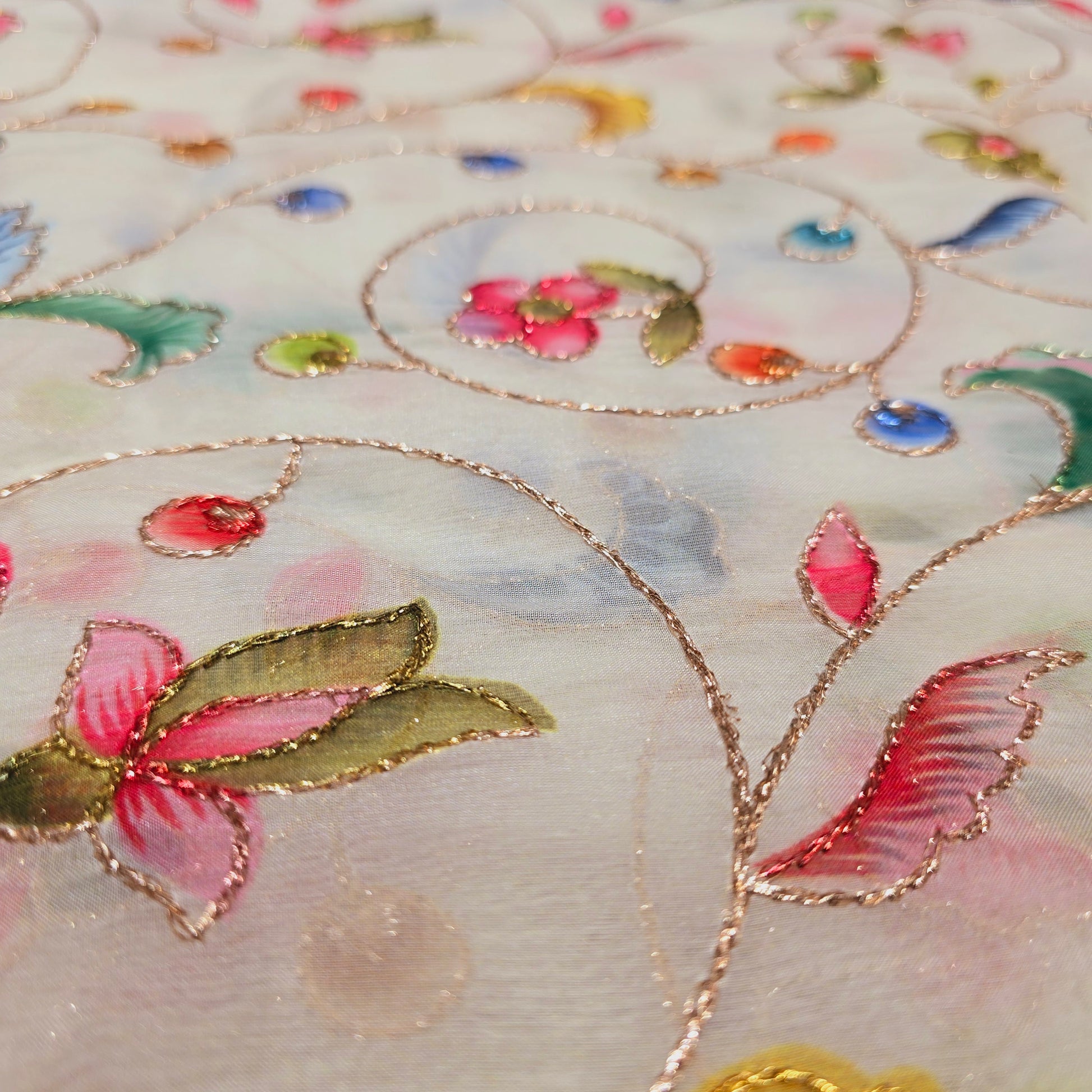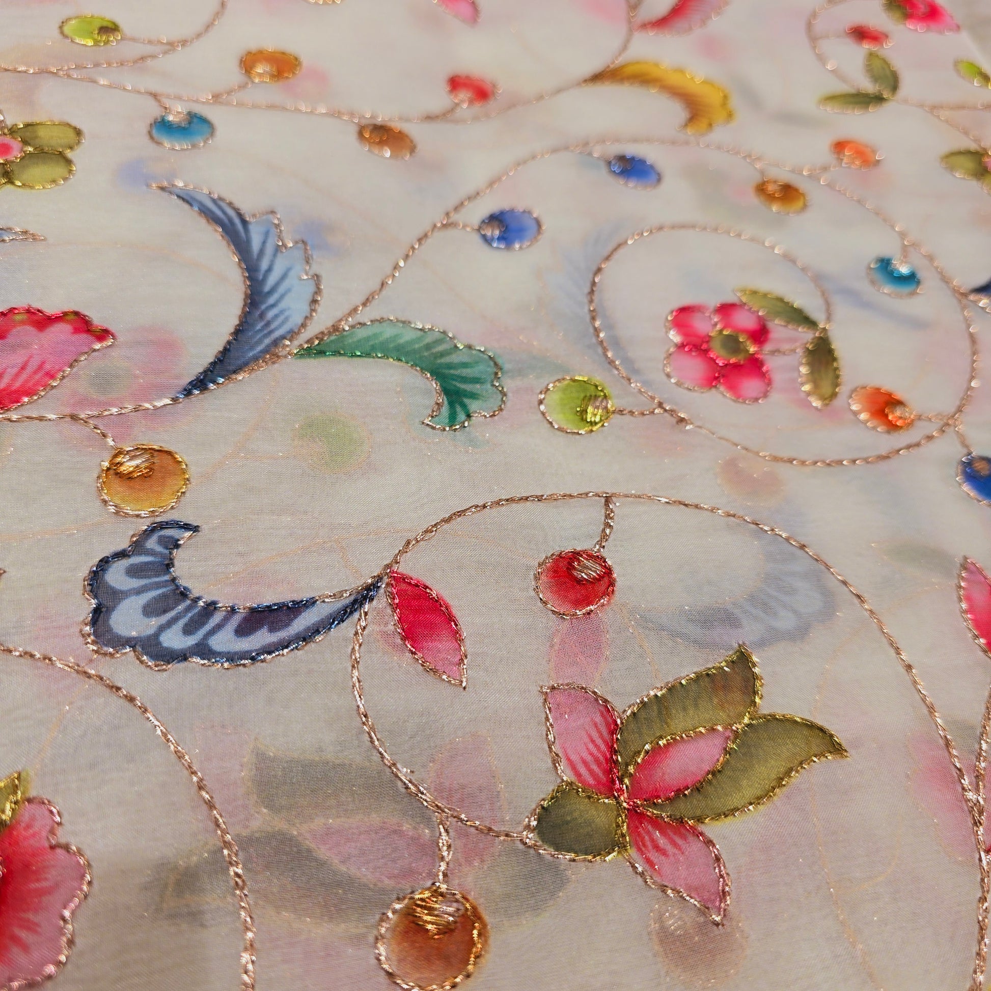 Expertly crafted from lightweight organza and adorned with delicate floral Aariwork, this exquisite mint fabric brings elegance and sophistication to any project. The intricate design and high-quality material ensure a luxurious and timeless finish. Elevate your creations with this beautiful fabric.