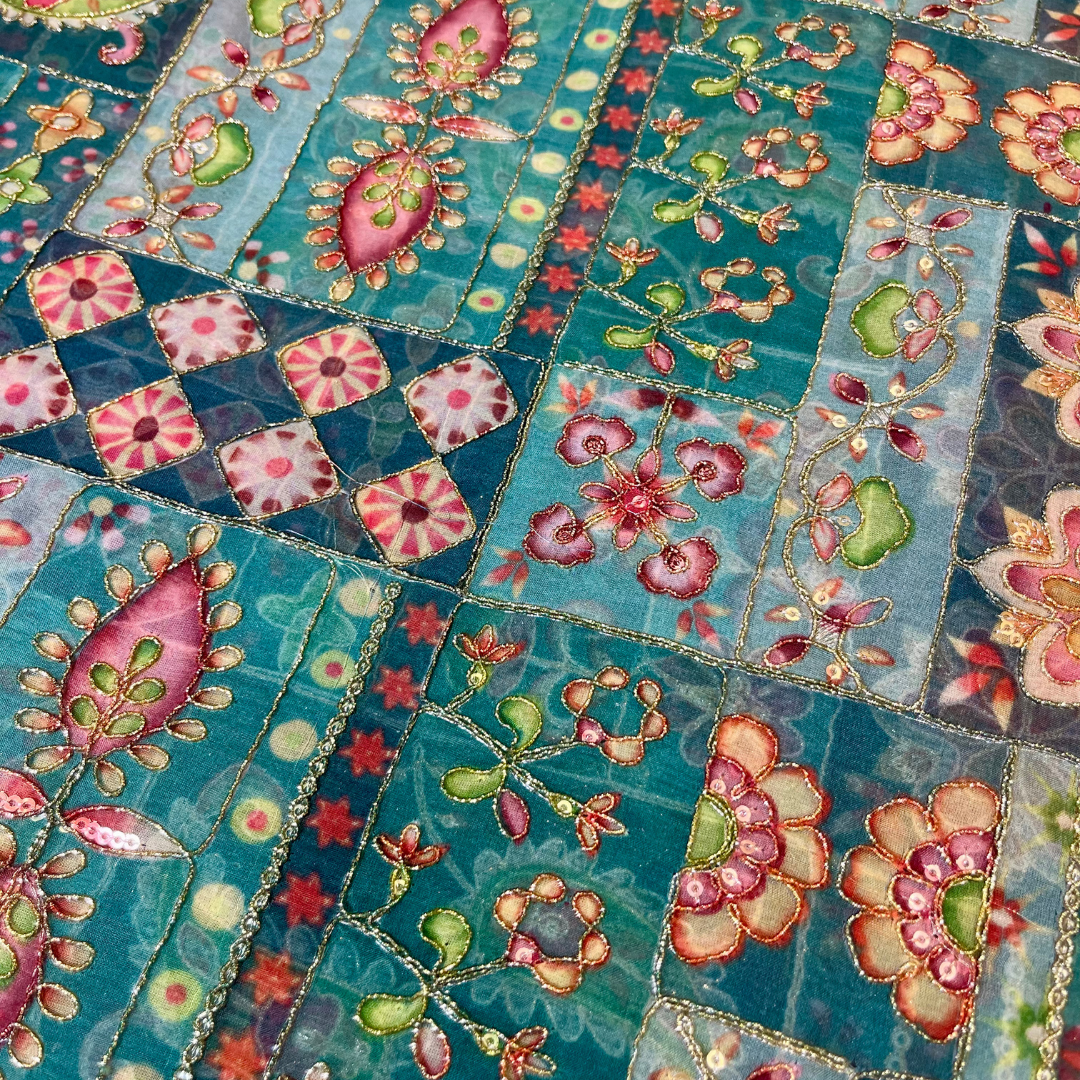 Make a statement with our stunning Organza with Multi-Color Highlights in Sea Green. This luxurious fabric features a beautiful combination of vibrant hues, with a striking sea green highlight that adds depth and charm to the overall design. The soft, lightweight texture of organza, combined with the multi-color highlights, creates a sophisticated and elegant look, perfect for any occasion