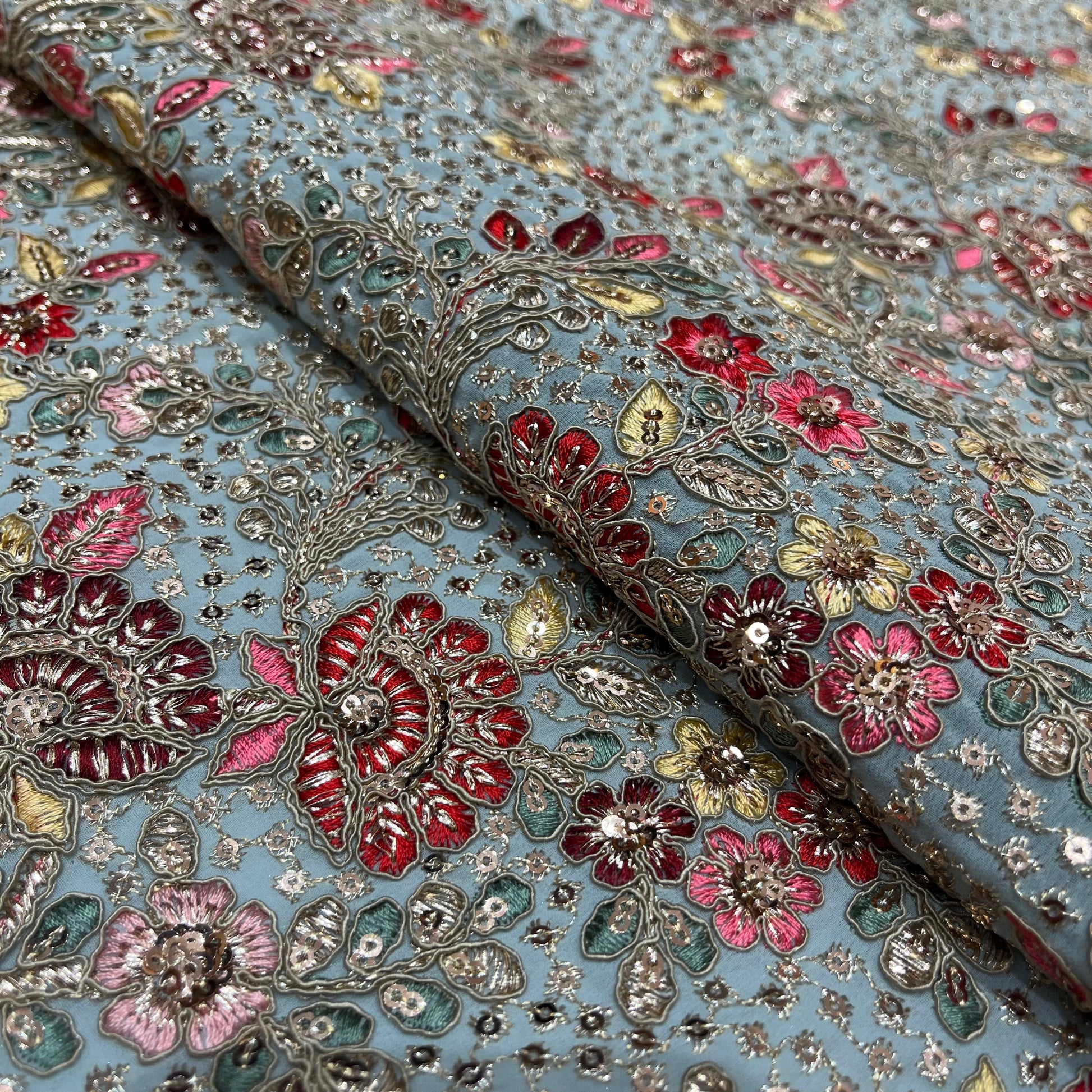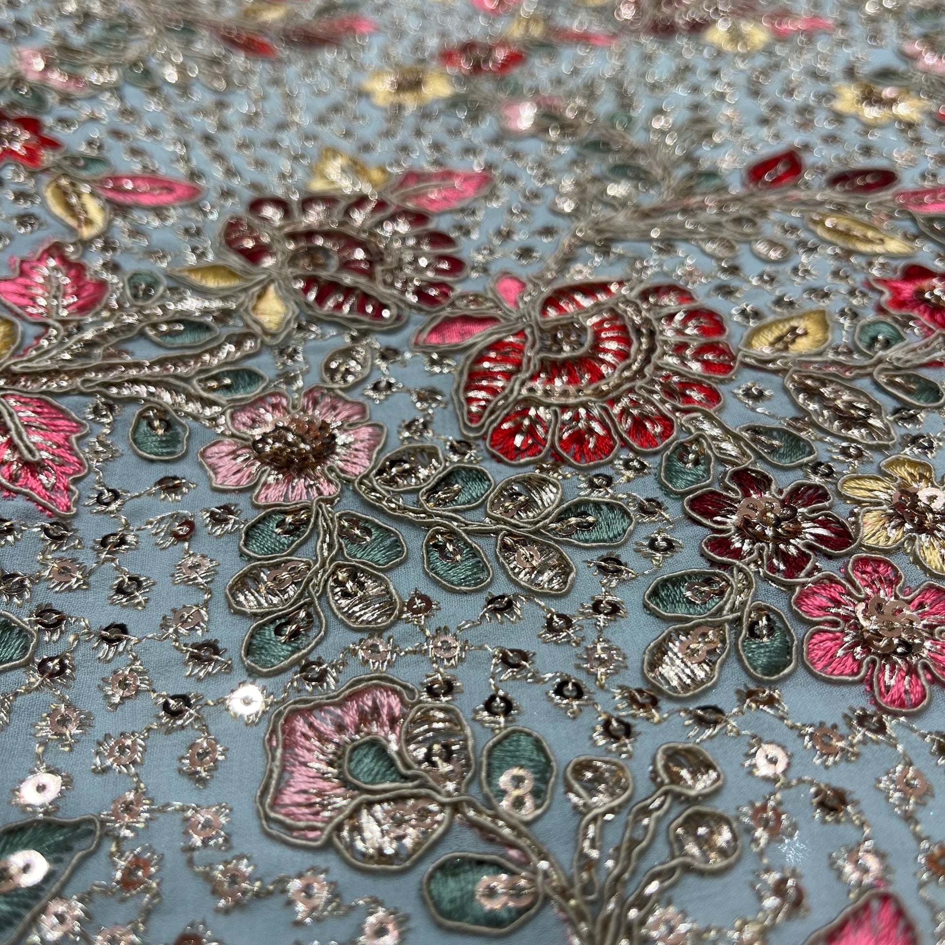 Made with high-quality georgette fabric, our Royalty Fabric in Blue showcases intricate threadwork and elegant gold sequence detailing. Perfect for adding a touch of refinement and luxury to any outfit. Elevate your wardrobe with this exquisite fabric, fit for royalty.