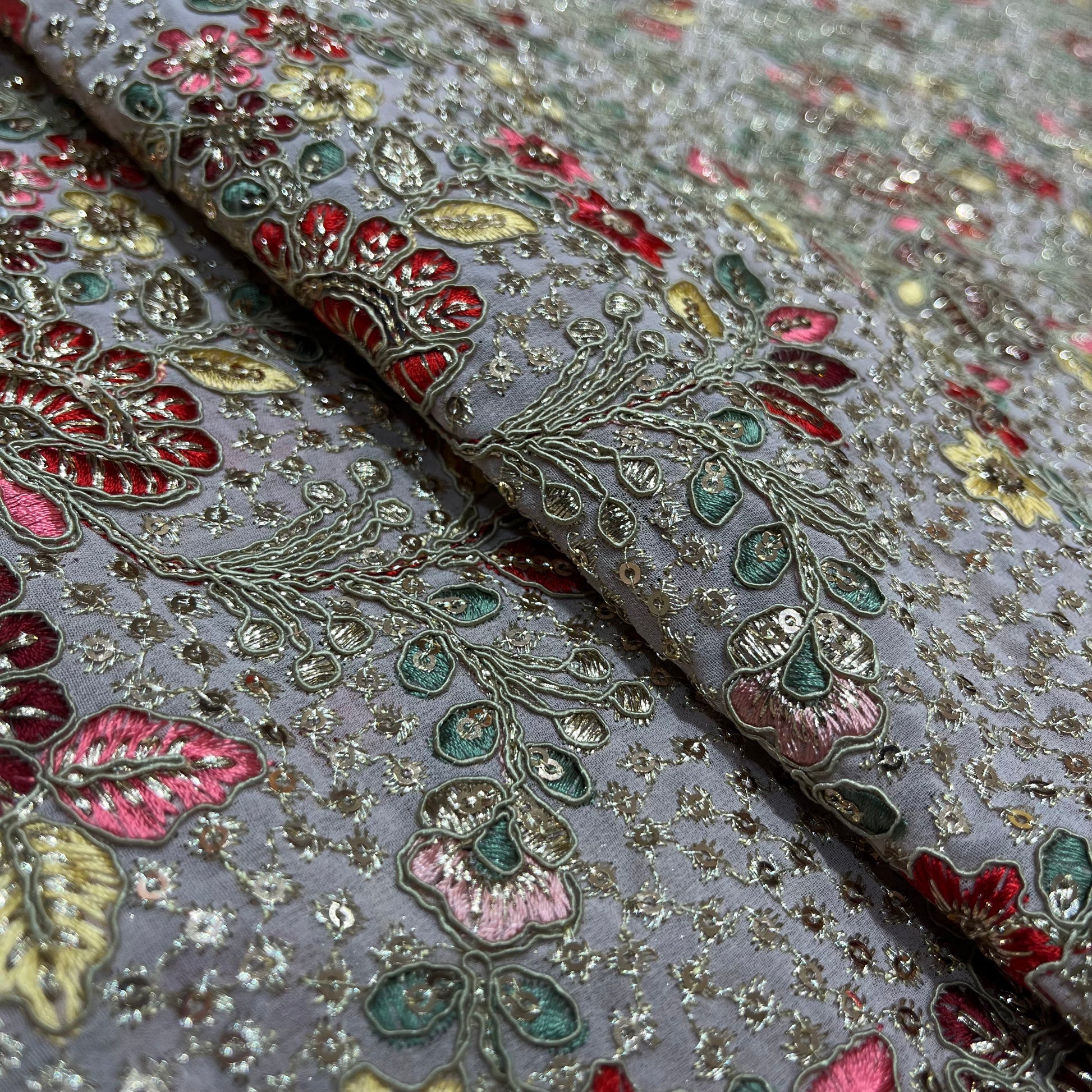 Expertly crafted, our Royalty Fabric in Grey is made from luxurious georgette and adorned with exquisite threadwork and gold sequence. Experience the perfect blend of elegance and opulence with this high-quality fabric. Elevate any outfit with its soft texture and sophisticated design.